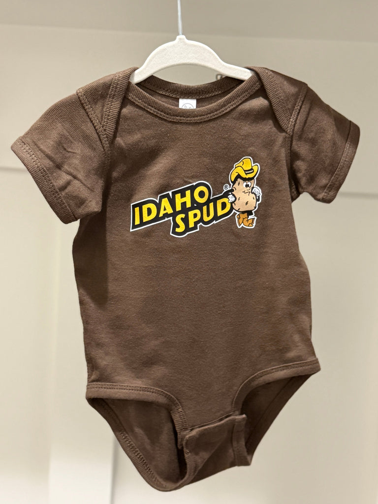 Dress your little Idahoan in classic Spud style! This cozy brown onesie features our cheerful cowboy “Spud Guy” and bold retro Idaho Spud logo—perfect for tiny fans of the iconic Idaho treat. Soft, comfy, and easy to snap, it’s made for everyday wear, photo ops, and all the adorable moments in between.